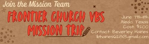 Join the MCBC Mission Team as we travel to Aledo, Texas to help Frontier Church with their Vacation Bible School. Along with helping to set-up, our team will be aiding in Bible Study, crafts, recreation, snacks, and music. This will be a great time of fun, fellowship, and spreading the love of Jesus.